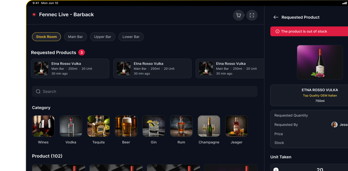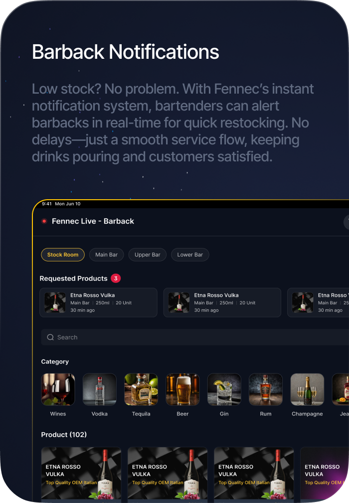Low stock? No problem. With Fennec’s instant notification system, bartenders can alert barbacks in real-time for quick restocking. No delays—just a smooth service flow, keeping drinks pouring and customers satisfied.