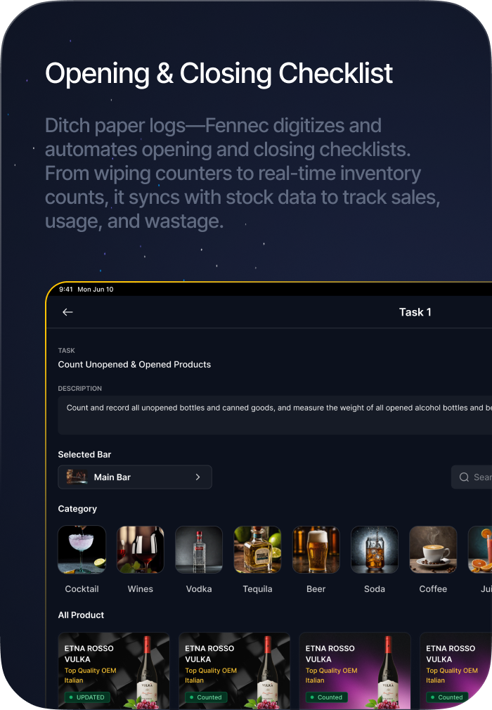 Ditch paper logs—Fennec digitizes and automates opening and closing checklists. From wiping counters to real-time inventory counts, it syncs with stock data to track sales, usage, and wastage.
