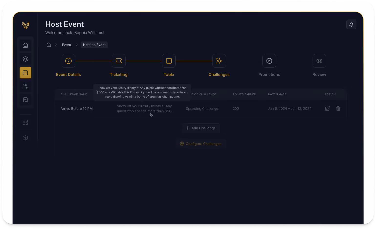 Create event-specific challenges to encourage participation, such as high-spender rewards or drink competitions, making the night more exciting for your guests.